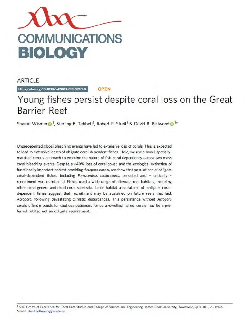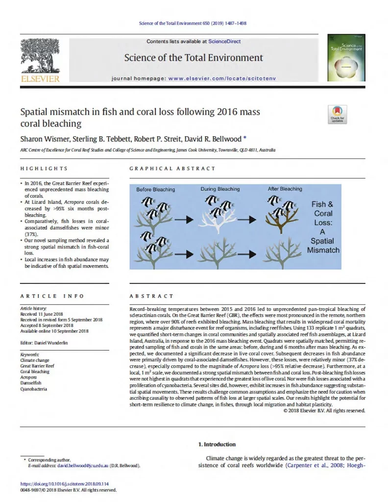 Mass bleaching events occur when the symbiotic relationship between corals and their photosynthetic algae breaks down in response to prolonged, elevated water temperatures during marine heat waves. These events are climate driven and are sadly increasing in frequency. Widespread coral mortality often follows bleaching events and represents a major disturbance event for reef organisms, especially for reef fishes that depend on corals for food or shelter.