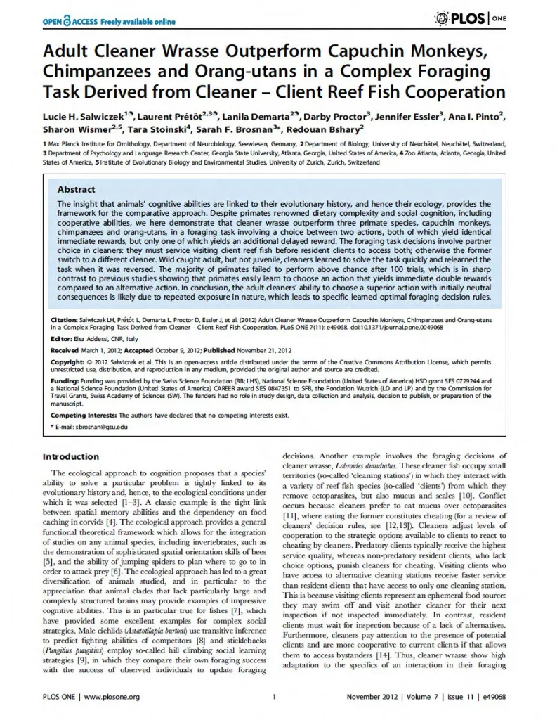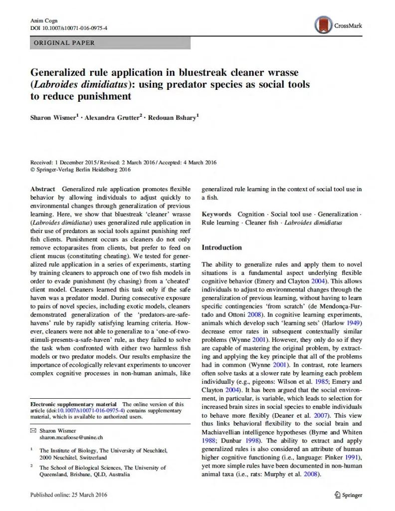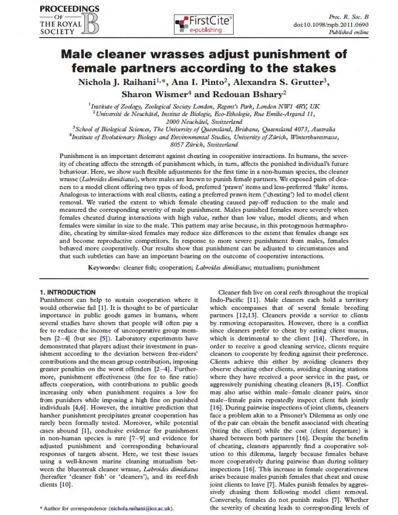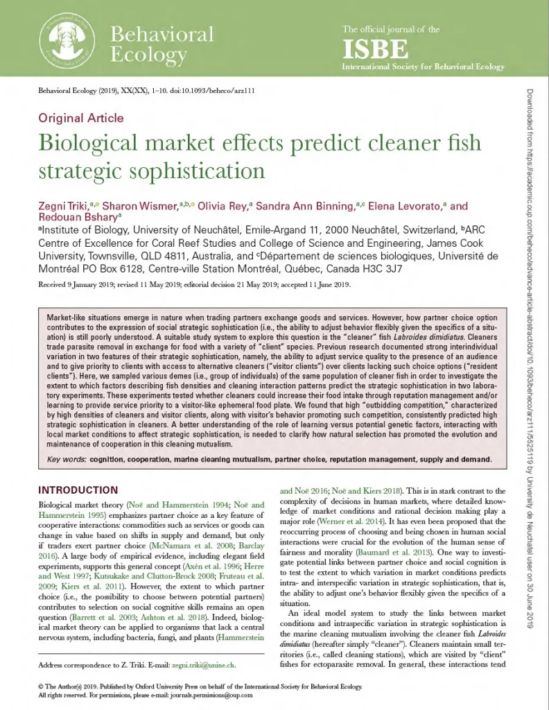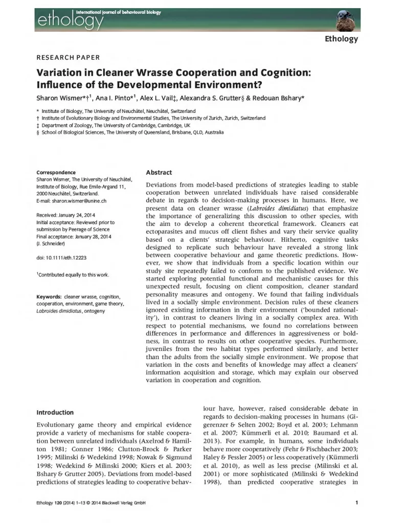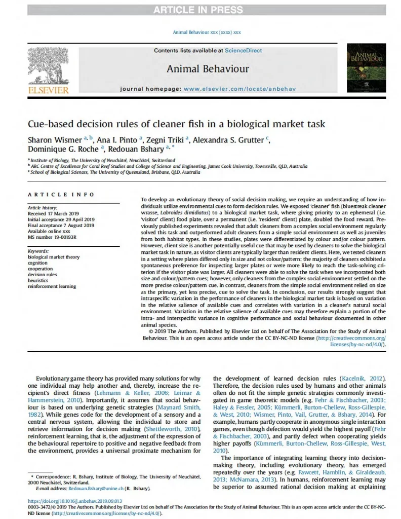 Using cleaner wrasse as a model system for cooperation, I investigated important mismatches between standard theoretical predictions regarding animal decisions during cooperative interactions and experimental data, and explored how well cleaner wrasse are able to identify and use relevant cues for decision making.