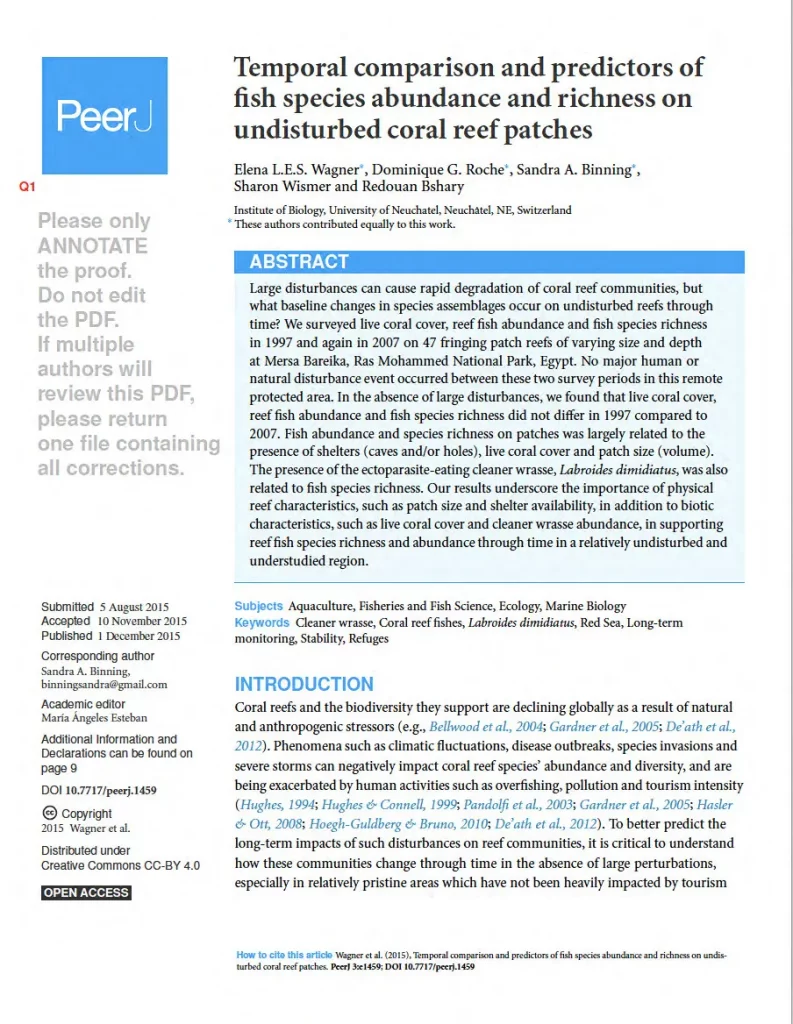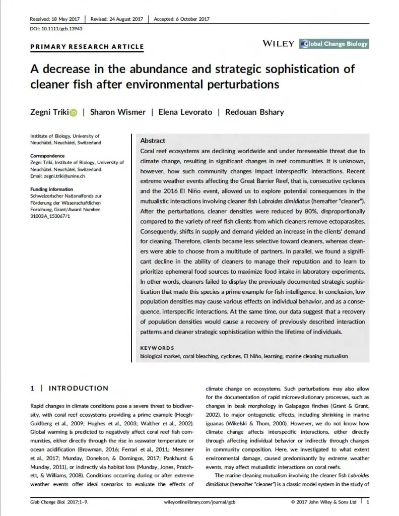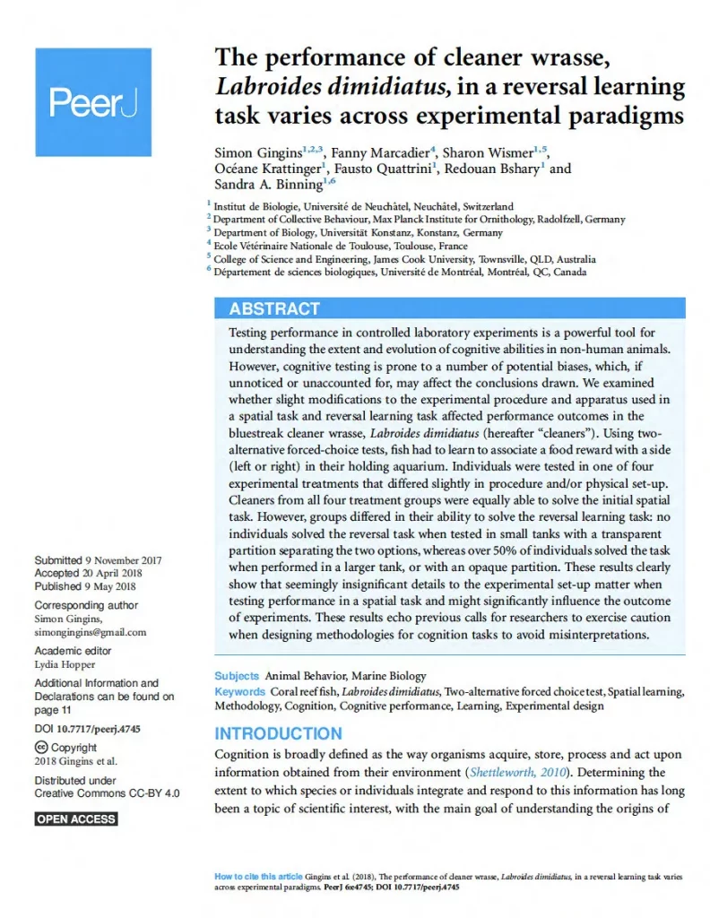 My postgraduate research focused primarily on the behavioural strategies of bluestreak cleaner wrasse (Labroides dimidiatus) – one of the ocean’s most clever fishes! Cleaner wrasse live on coral reefs across the Indo-Pacific Ocean and maintain territories called ‘cleaning stations’. As their name suggests, cleaner wrasse clean and remove ectoparasites from so-called fish clients.
