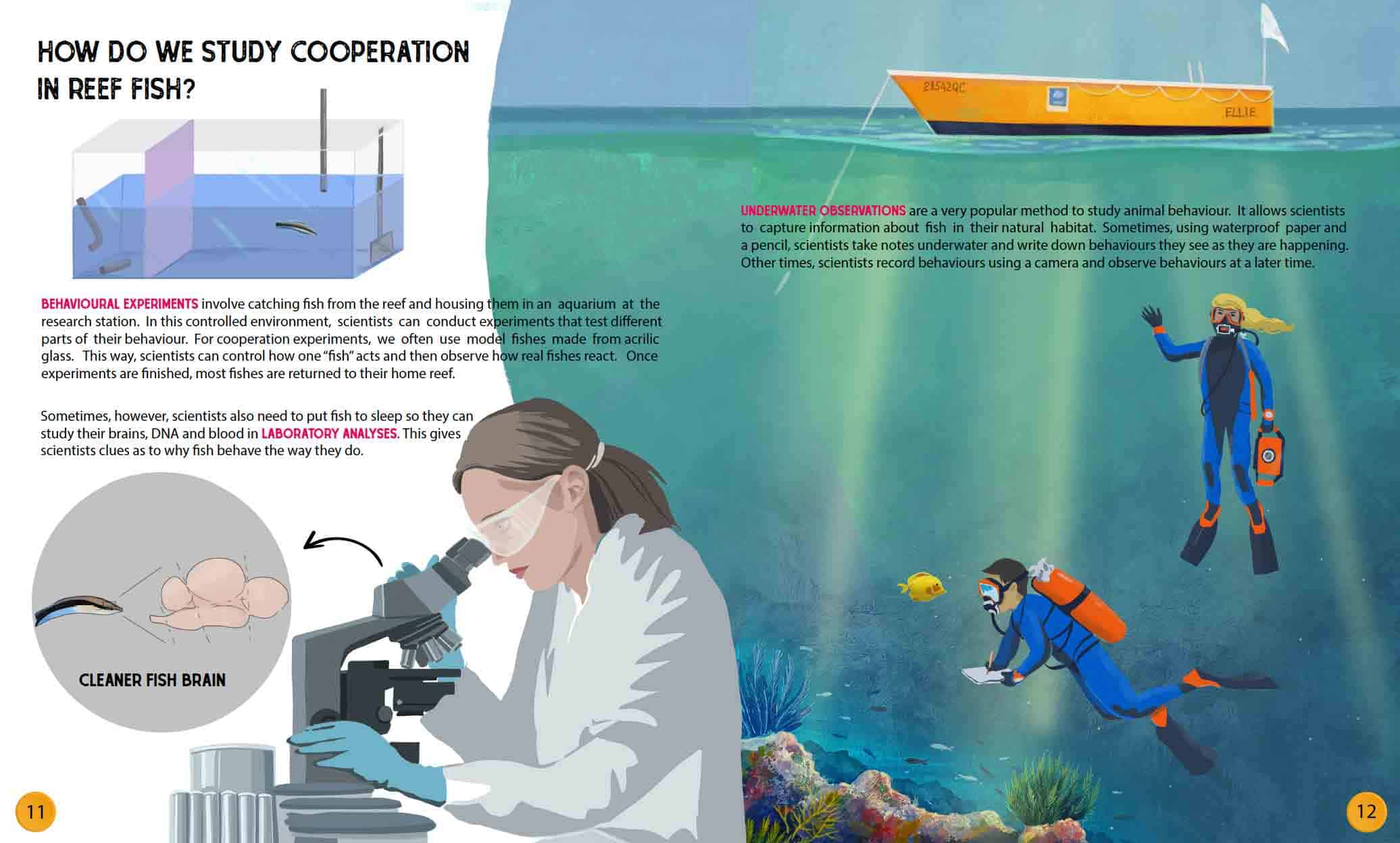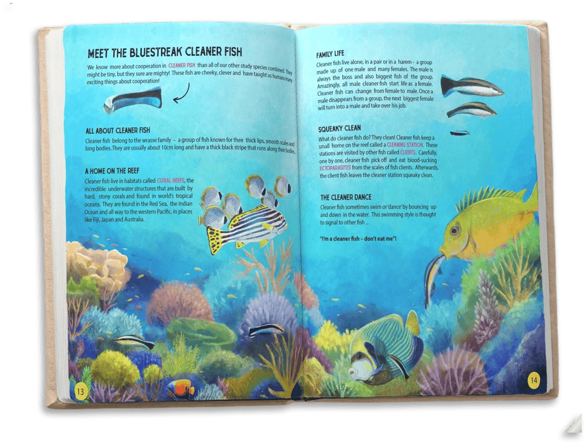 Better Together: lessons from cleaner fish and beyond is part of an AGORA science communication outreach project that is funded by the Swiss National Science Foundation. This AGORA project aims to bridge the gap between scientific research and the public and provides a direct ‘scientist to public’ education channel for communicating research on cooperation theory. This printed book and free interactive E-book showcases the incredible behaviours of blue streak cleaner fish and teaches young readers all about the fascinating topic of cooperation. It showcases research by Prof. Redouan Bshary at the University of Neuchatel, Switzerland.